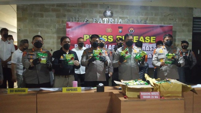 Polisi mengungkap kasus 21 kilogram sabu di Makassar, Sulawesi Selatan (Sulsel). Dua pelaku turut diamankan buntut kasus tersebut.