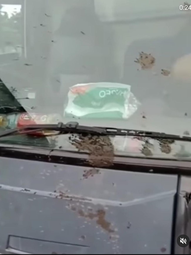 "Barusan, nih, ditimpa bocah-bocah iseng, nih, lumpur sampai ke dalam, untuk kenek nggak apa-apa, kena muka kenek, di sini posisinya," ujar perekam.