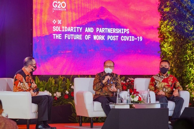 Saat menjadi pembicara Kick Off G20 on Education and Culture, Gelar Wicara I bertajuk 'Solidaritas dan Kemitraan Serta Masa Depan Dunia Kerja Pasca COVID-19' secara virtual, Rabu (9/2), Sekretaris Jenderal Kemnaker Anwar Sanusi menjabarkan pada Presidensi G20 Tahun 2022, Kemnaker akan mengusung empat isu/tema prioritas.