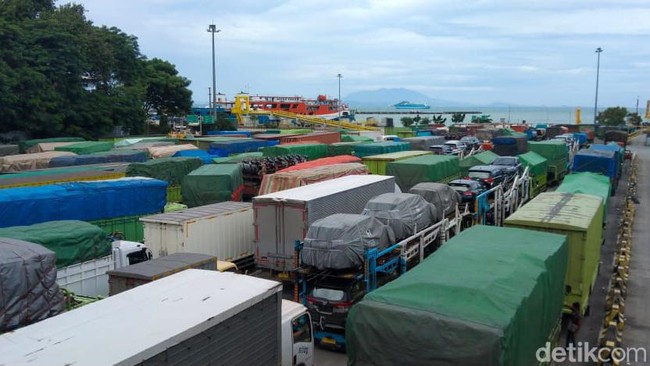 Kantong parkir tiap dermaga dipenuhi kendaraan yang hendak menyeberang ke Bakauheni, Lampung.