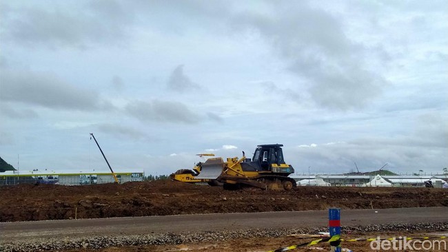 Sekitar 20 meter dari lokasi, sejumlah pekerja melakukan penimbunan untuk meninggikan sebuah area kosong di depan sirkuit. Terlihat pula sejumlah alat berat, seperti truk, ekskavator, dan tronton.