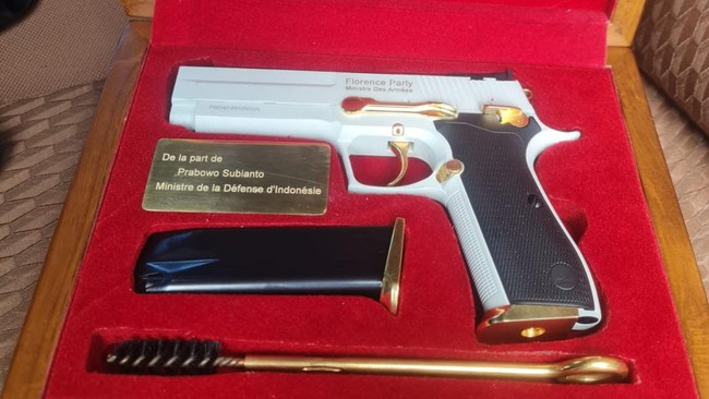 Menurut Dahnil, menteri Prancis Parly sudah pernah dihadiahi keris oleh Prabowo. Lantas kali ini Prabowo menghadiahkan pistol G2 Elite yang diproduksi PT Pindad.