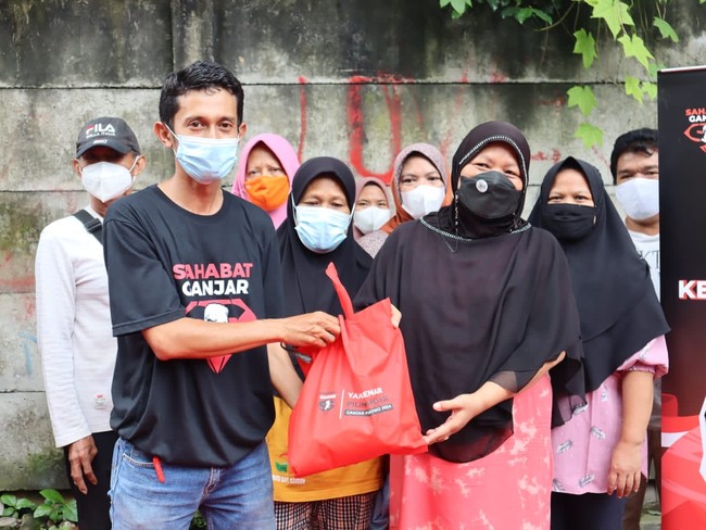 Relawan Sahabat Ganjar menggelar kegiatan bagi-bagi paket sembako di sejumlah titik di Jakarta. Paket sembako ini ditujukan untuk membantu masyarakat yang terdampak pandemi COVID-19.