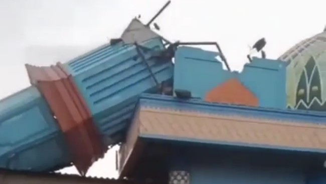 Dalam video yang dilihat detikcom pada Rabu (16/2/2022), terlihat satu dari dua menara di Masjid Al-Ikhlas yang ambruk menimpa rumah warga. Tampak warga mendekati reruntuhan menara masjid tersebut.