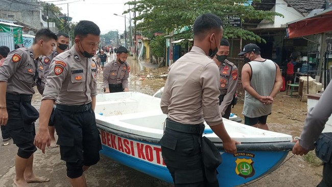 Warga Pondok Gede Permai, Kota Bekasi, Jawa Barat (Jabar), mulai dievakuasi. Sejumlah polisi melakukan evakuasi menggunakan perahu.