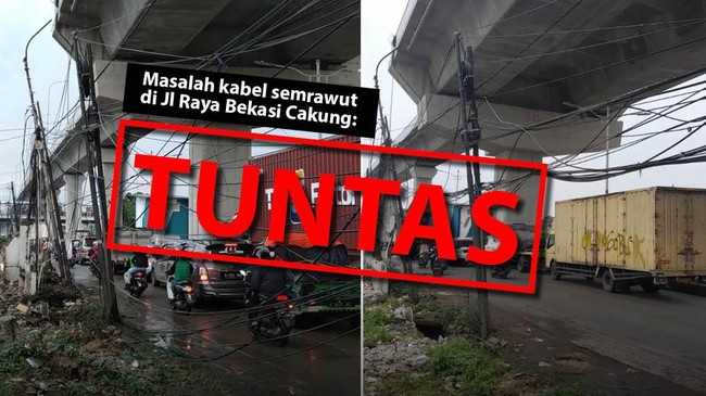 Pantauan detikcom di lokasi, Jumat (28/1), kabel semrawut melintang lebih dari 1 kilometer. Puluhan kabel menjuntai tak beraturan. Bahkan beberapa kabel menyentuh tanah. Beberapa tiang penyangga kabel pun miring.