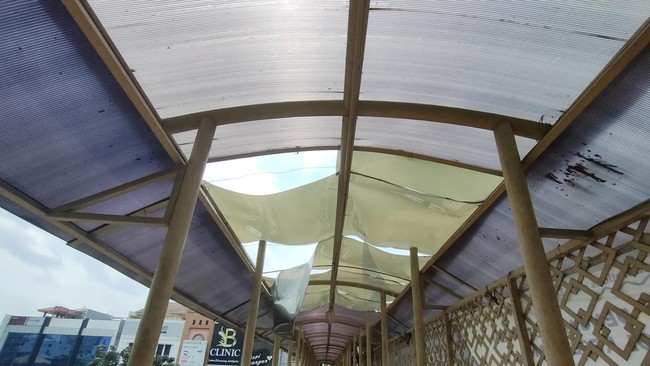 Pantauan detikcom di lokasi, Rabu (9/2), dua bagian fiber atap terlepas. Beberapa bagian tak menyatu sehingga kala hujan air bisa langsung membasahi JPO.
