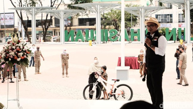 Ridwan Kamil pun memberikan sepeda kepada anak-anak yang bisa membacakan poin-poin Pancasila itu.