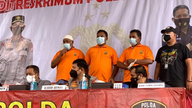 Pantauan detikcom, ada tiga pelaku yang digiring ke lokasi jumpa pers di Polda Metro Jaya, Selasa (22/2/2022) siang ini. Para pelaku terlihat memakai baju tahanan dan tangan diborgol kabel ties.