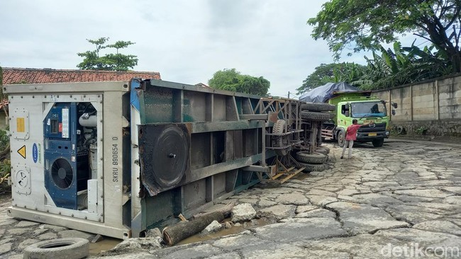 Pantauan detikcom di lokasi, Kamis (24/2/2022) pukul 12.00 WIB peti kemas kontainer masih belum dievakuasi. Terpantau peti kemas tersebut masih berada di jalan yang kondisinya sangat rusak parah dan amblas sehingga membuat kemiringan di jalan.