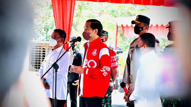 Presiden Joko Widodo (Jokowi) meninjau vaksinasi COVID-19 di Palu, Sulawesi Tengah (Sulteng). Jokowi memuji antusiasme warga Sulteng dalam mengikuti vaksinasi.
