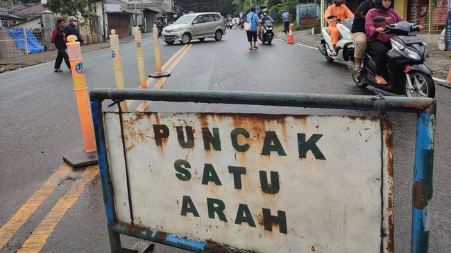 Pantauan detikcom di Simpang Gadog, Sabtu (26/2/2022) pukul 13.00 WIB, tampak petugas dan warga sekitar memasang papan bertulisan 'Puncak Satu Arah'.