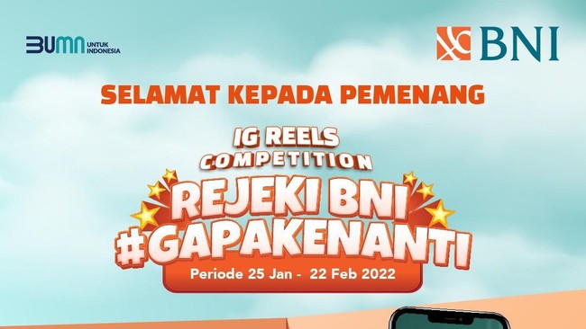 IG Reels Competition BNI #GaPakeNanti yang diselenggarakan oleh BNI bekerja sama dengan detikcom dari tanggal 25 Januari hingga 22 Februari 2022 telah berakhir. Kompetisi ini pun telah mendapatkan keputusan untuk para pemenang yang berhak mendapatkan 1 logam emas 5 Gram atau saldo e-wallet hingga belasan juta rupiah untuk 15 orang pemenang.