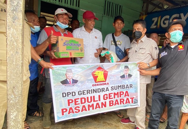 DPD Partai Gerindra Sumatera Barat (Sumbar) menyalurkan bantuan untuk korban gempa di Sumatera Barat. Bantuan diantarkan langsung kepada korban gempa di dua daerah paling terdampak, yakni Kabupaten Pasaman Barat (Pasbar) dan Pasaman.