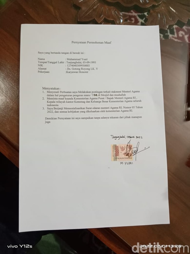Dalam isi surat permohonan maaf tersebut, ada tiga poin yang disampaikan TS dan MY, yakni menyesali perbuatannya, memohon maaf kepada Kemenag dan Menteri Agama RI, serta berjanji akan mensosialisasikan Surat Edaran Menteri Agama RI Nomor 05 Tahun 2022.