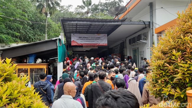 Pantauan detikcom di kantor Pos Jalan Juanda, Kota Bogor, Jumat (4/3/2022), ratusan orang memadati ruangan di samping Kantor Pos yang dijadikan lokasi pencairan BPNT. Antrean warga menimbulkan kerumunan dan mengabaikan protokol kesehatan.