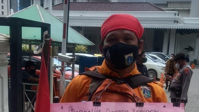 Jejen Sujana (43) menyambangi Balai Kota DKI Jakarta untuk mengadu kepada Gubernur Anies Baswedan karena diputus kontrak kerja sebagai tenaga Penanganan Sarana dan Prasarana Umum (PPSU). Jejen tiba di Balkot dengan berjalan kaki dari rumahnya.