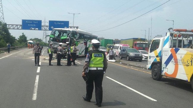 Bus pariwisata yang membawa rombongan peziarah dari Palembang, Sumatera Selatan, terlibat kecelakaan dengan truk di Tol Dupak arah Waru, Jawa Timur (Jatim). Tiga orang tewas dalam kecelakaan ini.