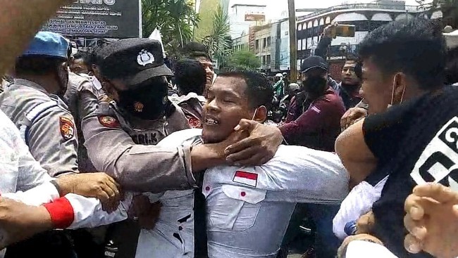 Petugas keamanan yang berada di lokasi langsung mendekat ke massa. Kericuhan kemudian terjadi. Massa dan aparat keamanan terlibat aksi tarik-menarik hingga ke tengah jalan.