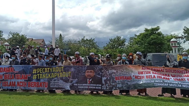 Pantauan detikcom, massa menggelar aksi di halaman Kantor Gubernur Aceh di Banda Aceh, Senin (7/3/2022). Massa membawa sejumlah spanduk, di antaranya bertulisan 'aksi damai... Aceh Bela Islam umat Islam bersatu'.