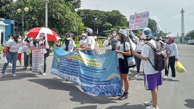 Pantauan detikcom, Selasa (8/3/2022), pukul 09.45 WIB, tampak massa aksi berkumpul di depan Patung Kuda. Mereka terlihat menggunakan pakaian berwarna putih.