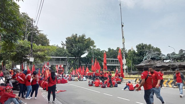 Pantauan detikcom di lokasi, pukul 14.18 WIB, massa buruh tampak berada di jalanan sekitar Patung Kuda. Terdapat dua mobil komando di lokasi demo.