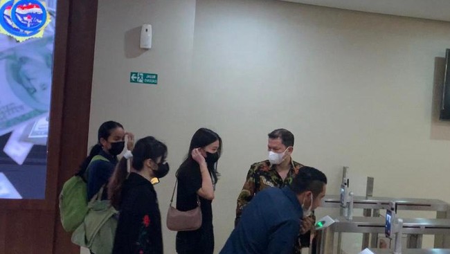 Vanessa berjalan cepat masuk ke area dalam Gedung Bareksrim Polri. Vanessa mengenakan jaket hitam dengan motif bunga merah, serta dan masker hitam.