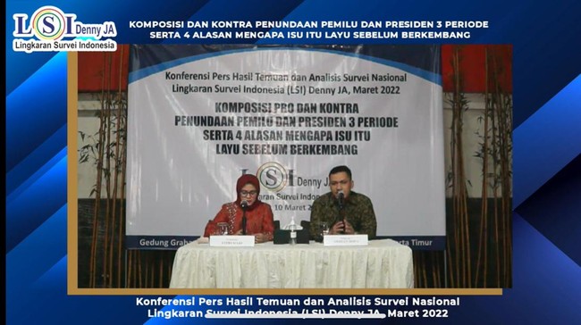 LSI Denny JA merilis sikap masyarakat terkait wacana penundaan Pemilu 2024 dan perpanjangan masa jabatan presiden tiga periode. Mayoritas responden dari berbagai segmen pemilih menolak wacana tersebut.