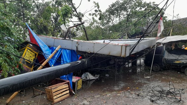 "Alhamdulillah nggak ada korban jiwa, cuma ada beberapa gerobak pedagang yang tertimpa. Gerobak masih kosong, pedagang kan jualannya sore sampe malam. Reklame ini tingginya sekitar 12 meter," ujar Komandan Rescue Pemadam Kebakaran Kabupaten Bogor, Diki Mutakin, saat ditemui di lokasi kejadian.