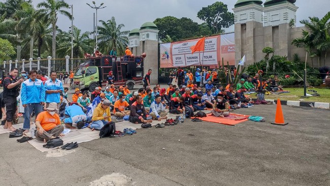 Pantauan detikcom di lokasi, massa berdatangan sejak pukul 12.18 WIB, Jumat (11/3/2022). Mereka kemudian menggelar salat Jumat di depan gedung DPR.