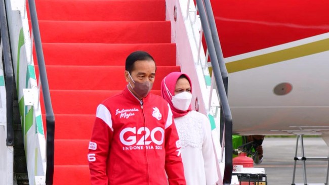 Presiden Joko Widodo (Jokowi) dan istrinya, Iriana, tiba di Bandara Internasional Sultan Aji Muhammad Sulaiman, Balikpapan, Kalimantan Timur (Kaltim). Presiden Jokowi dijadwalkan memberikan pengarahan kepada seluruh gubernur di Indonesia.