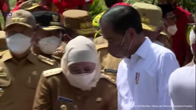 Momen Khofifah menyerahkan secarik kertas itu terlihat lewat tayangan di akun YouTube Sekretariat Presiden, Senin (14/3/2022). Momen itu terjadi setelah Jokowi dan para gubernur berfoto bersama usai penyatuan tanah dan air.