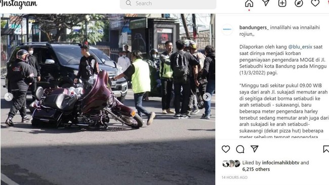"Beberapa meter sebelum tempat pengendara Harley tersebut, saya sudah berhenti karena lihat pengendara tersebut sudah putar arah. Tiba-tiba pengendara tersebut jatuh entah kenapa," tutur dia sebagaimana dilihat detikJabar dalam unggahan @bandungers