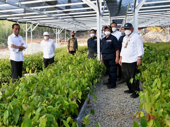 Presiden Joko Widodo (Jokowi) meninjau Persemaian Mentawir di Desa Mentawir, Penajam Paser Utara, Kalimantan Timur (Kaltim). Jokowi mengatakan pembangunan Ibu Kota Negara (IKN) Nusantara diawali dengan rehabilitasi lahan.