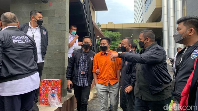 Tersangka kasus Quotex, Doni Salmanan, dipamerkan polisi dalam jumpa pers di Mabes Polri. Doni sempat melambaikan tangan ke arah wartawan.