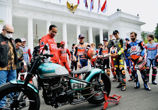Sebelumnya, Jokowi melepas parade 20 pebalap MotoGP dari Istana menuju Bundaran HI Jakarta. Jokowi sempat memamerkan motor custom RI 1 itu ke para 20 pebalap di halaman Istana.