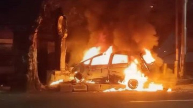"Kemudian kendaraan minibus Honda jazz tersebut terbakar. Mengakibatkan kerugian materi kerusakan kendaraan dan kerugian materi kerusakan papan reklame yang terbakar," terang Sigit.