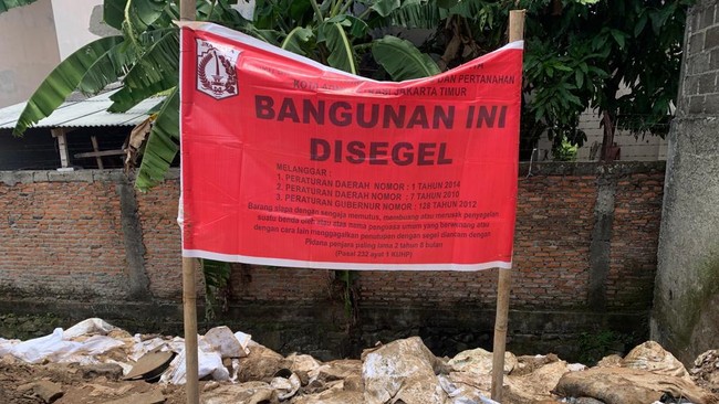 Dilihat detikcom, Kamis (17/3/2022), keterangan segel tersebut terbuat dari spanduk berwarna merah. Segel itu tertera nama Suku Dinas Cipta Karya, Tata Ruang, dan Pertanahan Kota Administrasi Jakarta Timur, dengan logo Pemprov DKI Jakarta. Tertulis BANGUNAN INI DISEGEL.
