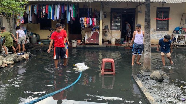 Pantauan detikcom di RT 16 Pondok Bambu, air masih mengenang di halaman rumah warga. Tampak sejumlah anak-anak bermain dan mencari ikan di genangan air tersebut.