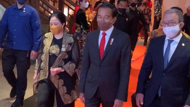 Pantauan detikcom di lokasi, Minggu (20/3/2022), Jokowi dan Puan tiba pada pukul 19.40 WITA. Setiba di lokasi, Jokowi, Puan dan Duarte tampak disambut oleh sejumlah pria dan wanita yang menggunakan baju adat khas Bali.
