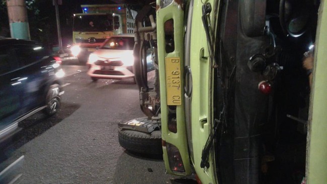 Sebuah kendaraan truk terguling di Jl Latumenten, Grogol, Jakarta Barat (Jakbar). Truk itu terguling hingga menutupi satu lajur jalan.