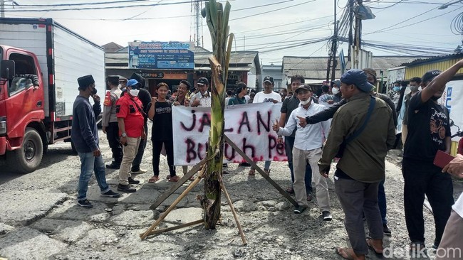 Sejumlah warga Kecamatan Batu Ceper, Kota Tangerang, berdemo menuntut perbaikan jalan. Warga mewujudkan aksi protes dengan menanam pohon pisang di jalan.