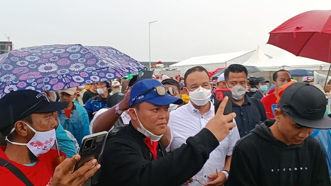Selain itu, Anies terpantau melayani selfie bersama pengunjung sambil menerjang kerumunan. Di momen ini, pengunjung sahut-sahutan menyebut Anies sebagai 'RI-1'.