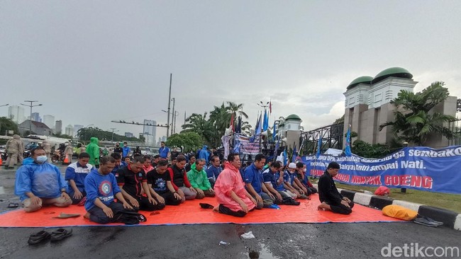 Massa buruh KSPSI (Konfederasi Serikat Pekerja Seluruh Indonesia) dan aliansi buruh lainnya menggelar demo di gedung DPR RI, Jakarta Pusat, hari ini. Di sela aksi, massa menggelar salat Zuhur berjemaah di tengah guyuran hujan.