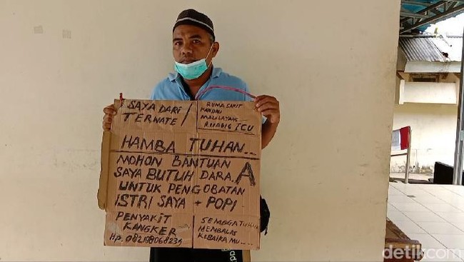 Diketahui pria tersebut bernama Ali Mudin Rumagia, warga Kelurahan Dufa-Dufa, Kecamatan Ternate, Kota Ternate, Maluku Utara (Malut). Dalam unggahan yang beredar di medsos Rabu (23/3), Ali berharap bantuan donor darah golongan A bagi istrinya yang mengidap kanker.