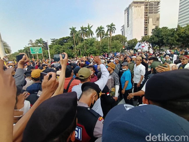 Dari pantauan detikcom, Jumat (25/3/2022) pukul 16.00 WIB, massa aksi PA 212 awalnya berada di kawasan Patung Kuda, Jakarta Pusat. Mereka memaksa agar bisa bergerak ke depan Istana.