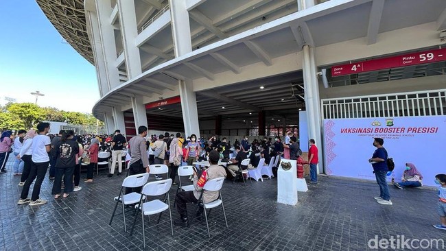 Direktorat Reserse Kriminal Khusus (Dirkrimsus) Polda Metro Jaya menggelar vaksinasi COVID-19 booster di Stadion Gelora Bung Karno (GBK) Senayan, Jakarta Selatan. Warga sudah antre sejak pagi.