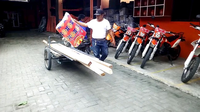 Dia tampak membawa seng, kayu dan kasur di atas becak. Ridwan tampak menemui petugas jaga di kantor tersebut untuk mengembalikan bantuan yang telah diberikan kepada dirinya.