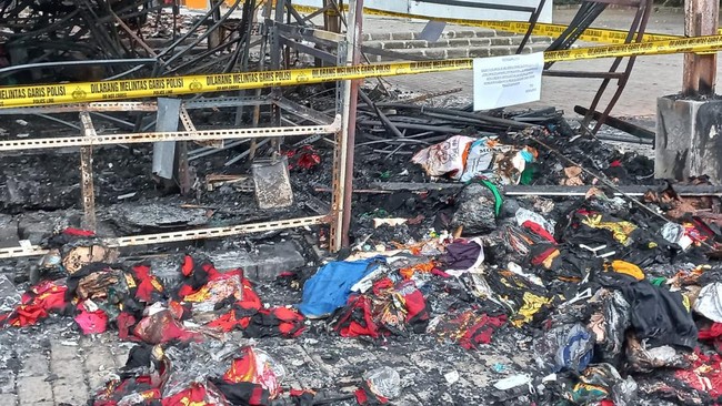 Pantauan detikcom di lokasi Kamis (31/3/2022) pukul 18.00 WIB, tampak baju-baju dagangan terbakar berserakan. Beberapa suvenir yang dijual di kios Lenggang juga hangus terbakar.