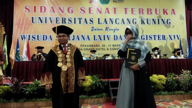 Suasana sedih menyelimuti prosesi wisuda mahasiswa Universitas Lancang Kuning Pekanbaru. Bagaimana tidak, seorang wanita hadir menggantikan keponakannya yang meninggal setelah ujian skripsi.
